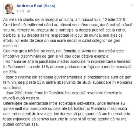 „Aş vrea să clarific de la început un lucru, am născut luni, 12 iulie 2010”, a scris Vass pe Facebook.