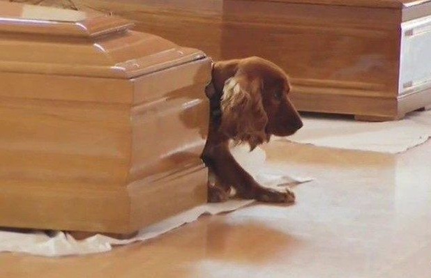 Cockerul spaniol nu se desprinde acum de sicriul in care zace trupul neinsufletit al celui care l-a iubit si l-a crescut ani de zile.