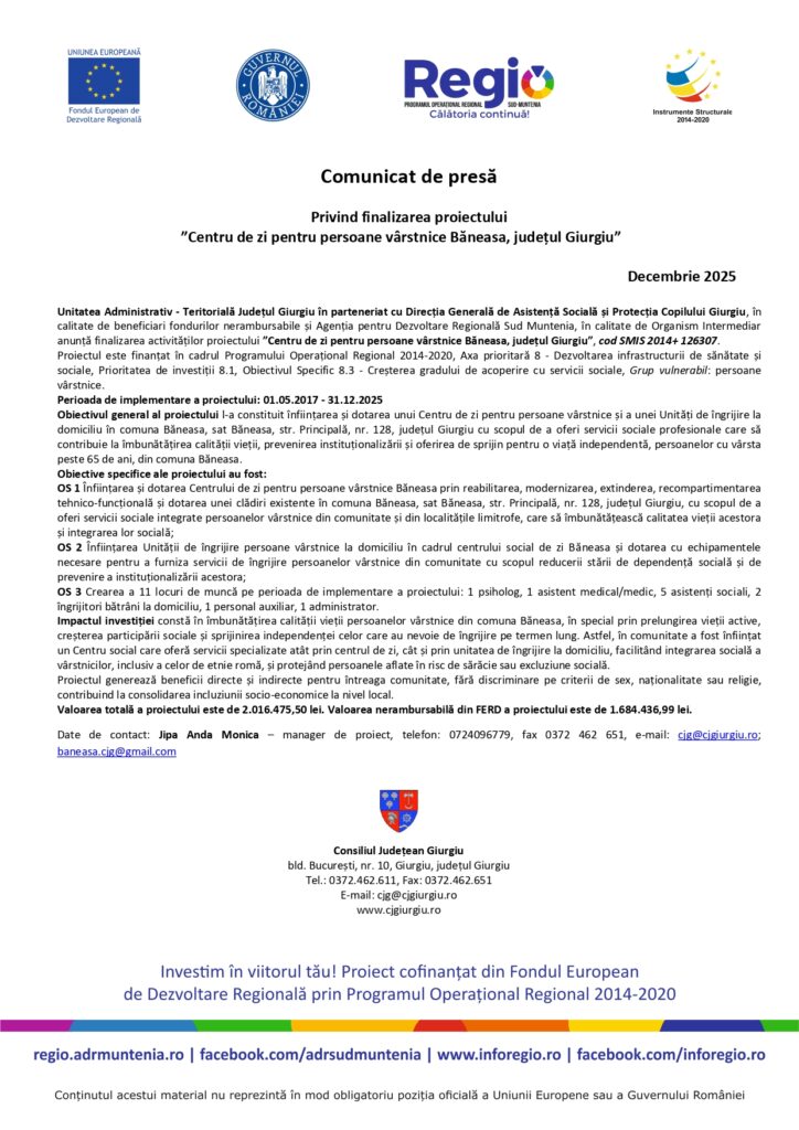 Actualitate, Comunicate de presa, comunicate fonduri europene Comunicat de presă privind finalizarea proiectului ”Centru de zi pentru persoane vârstnice Băneasa, județul Giurgiu De: ExpressPress Data publicare articol: luni, 8 decembrie 2025, 11:38 ExpressPress Autor Alte știri din Actualitate: Escrocheria cu locuri de muncă se răspândește rapid. Cum sunt înșelați oamenii care își caută serviciu? duminică, 7 decembrie 2025, 9:33 Prognoza meteo, 7 decembrie. Vreme mohorâtă în a doua zi de weekend. Ploile trecătoare apar izolat duminică, 7 decembrie 2025, 8:23 Rusia amenință voluntarii români din grupul de luptă „Getica”, aflați pe front în Ucraina: „Vor fi trași la răspundere”/ Getica: „Nu ar trebui să ne fie frică, ci milă de Rusia” sâmbătă, 6 decembrie 2025, 16:41