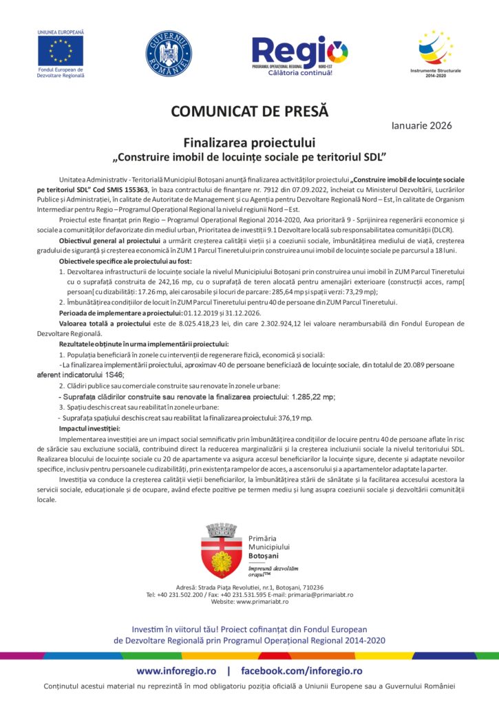 Actualitate, Comunicate de presa, comunicate fonduri europene Construire imobil de locuințe sociale pe teritoriul SDL De: ExpressPress Data publicare articol: joi, 29 ianuarie 2026, 9:53 ExpressPress Autor Alte știri din Actualitate: METEO Vremea se schimbă radical. Când se oprește ninsoarea și cât va ține zăpada? Vin temperaturi de 15 grade miercuri, 18 februarie 2026, 10:52 Vremea de primăvară se instalează treptat în România. Meteorologii au anunțat cât mai ține frigul marți, 17 februarie 2026, 11:49 DEZVOLTAREA INFRASTRUCTURII EDUCAȚIONALE PREȘCOLARE ÎN COMUNA CALOPĂR, JUDEȚUL DOLJ – CONSTRUIRE GRĂDINIȚĂ marți, 17 februarie 2026, 10:49