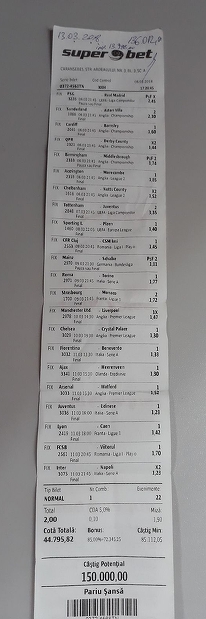 Un bănăţean din Caransebeş pasionat de fotbal a pariat pe 22 de meciuri pe un bilet de 2 lei care i-a adus un câştig de 150.000 de lei. Pariorul a repetat biletul de cinci ori, astfel că, punând la bătăie în total 10 lei, a câştigat şi încasat deja suma impresionantă de 750.000 de lei.