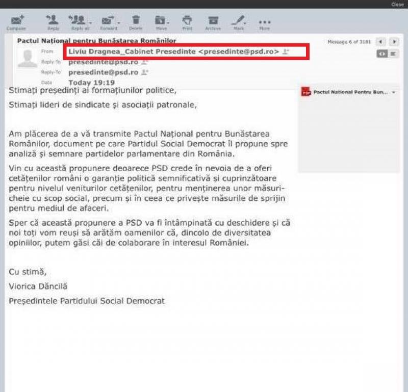 Premierul Viorica Dăncilă a transmis vineri tuturor partidelor parlamentare un „pact pentru bunăstarea românilor”. Documentul a fost trimis de președintele PSD de pe adresa de email folosită și de fostul președinte al partidului, Liviu Dragnea. Astfel, la descrierea persoanei care a trimis mesajul apare „Liviu Dragnea – Cabinet Președinte”.