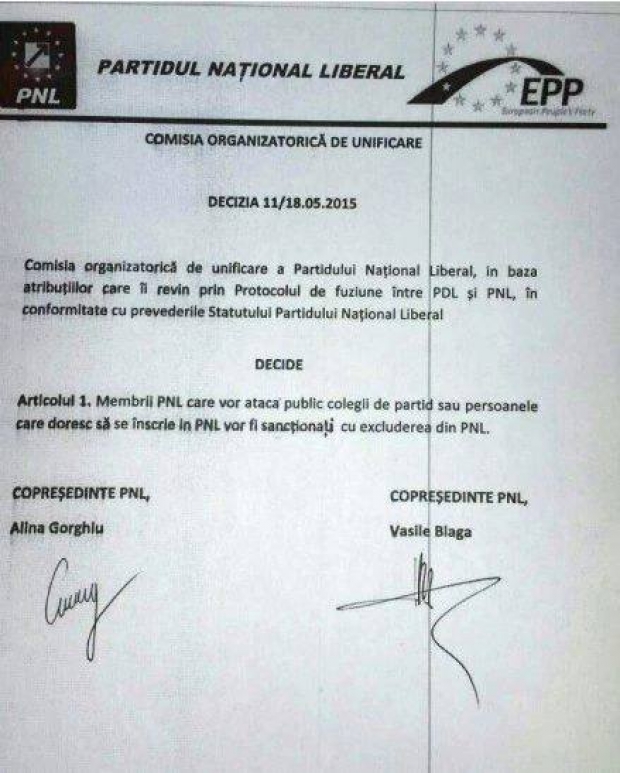 Scandalul iscat în ultima vreme în sânul PNL-ului scoate la iveală noi amănunte și dezvăluiri. Cristian Bodea, proaspăt exclus din PNL a prezentat pe facebook un act prin care cei doi copreşedinţi, Vasile Blaga și Alina Gorghiu anunţă că vor exclude din partid orice membru care atacă Partidul Naţional Liberal în public.