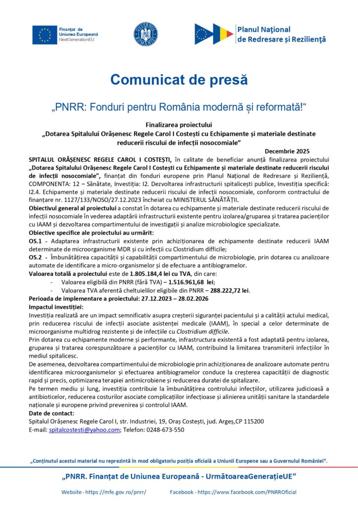 Actualitate, Comunicate de presa „Dotarea Spitalului Orășenesc Regele Carol I Costești cu Echipamente și materiale destinate reducerii riscului de infecții nosocomiale” De: ExpressPress Data publicare articol: luni, 29 decembrie 2025, 11:11 ExpressPress Autor Alte știri din Actualitate: UE sprijină tribunalul care îi va trage la răspundere pe liderii ruși vineri, 23 ianuarie 2026, 16:08 Pretul Auruli : care va fi noul plafon al prețului? Predicțiile Goldman Sachs și UBS vineri, 23 ianuarie 2026, 10:31 Războiul se apropie de graniţa cu România. O dronă cu explozibil a căzut într-o curte: „Dar românii ce au făcut, câte șchije de la drone au căzut?” vineri, 23 ianuarie 2026, 9:25