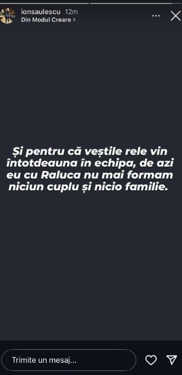Ulterior, a anunțat că el și Raluca nu mai formează un cuplu: ”Și pentru că veștile rele vin întotdeauna în echipă, de azi eu cu Raluca nu mai formăm niciun cuplu și nicio familie”.