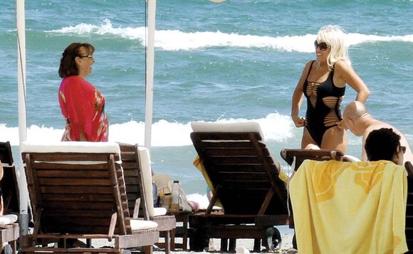 Conştientă că ochii sunt aţintiţi asupra ei, blonda nu prididea să-şi aranjeze costumul de baie, cu mişcări lascive şi provocatoare, în timp ce se întreţinea cu mama ei şi cu alţi doi cunoscuţi aflaţi pe şezlonguri.
