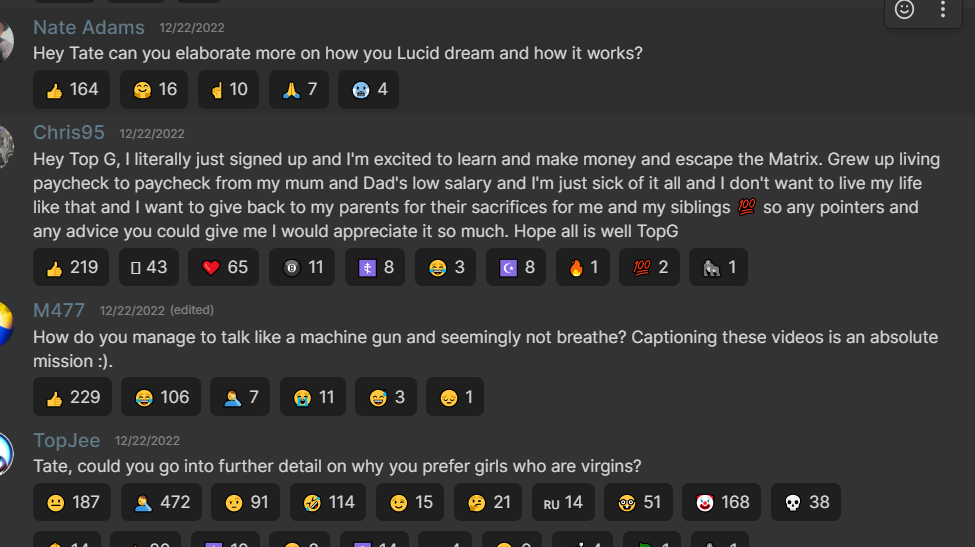 Influența pe care Andrew Tate o are asupra fanilor săi reiese inclusiv din acest grup, unde bărbații se simt neputincioși și le cer celorlalți membri să îi pedepsească pentru că nu pot să se țină de „porunci”. De regulă, pedeapsa constă în exerciții fizice.