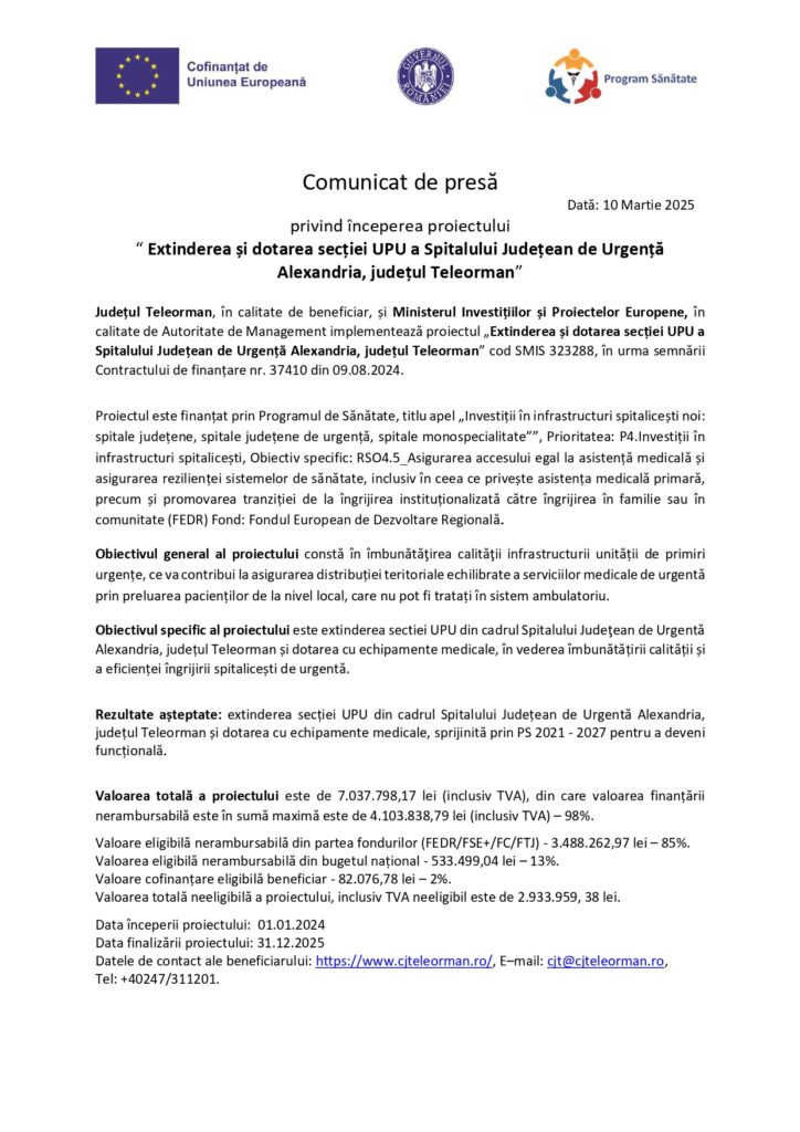 „Dotarea Spitalului Orășenesc Regele Carol I Costești cu Echipamente și materiale destinate reducerii riscului de infecții nosocomiale”