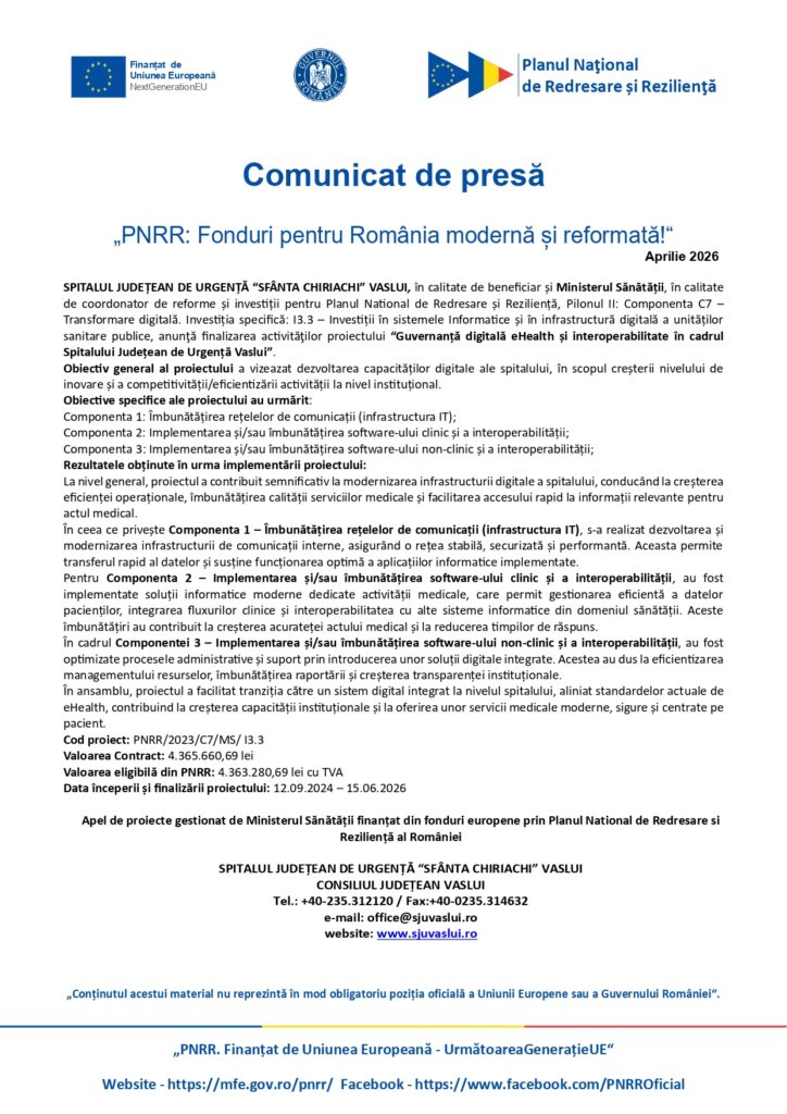 Actualitate, Comunicate de presa, comunicate fonduri europene Finalizarea activităţilor proiectului “Guvernanță digitală eHealth și interoperabilitate în cadrul Spitalului Județean de Urgență Vaslui”. De: ExpressPress Data publicare articol: marți, 28 aprilie 2026, 13:29 ExpressPress Autor Alte știri din Actualitate: Vara se instalează mai devreme în 2026. Luna mai vine cu episoade de caniculă și nopți tropicale luni, 27 aprilie 2026, 16:48 Renovare energetică clădiri rezidentiale multifamiliale: Bl. 15 – Str. Rahovei, Bl. 11A – Str. Teilor” – Componenta 2 – Bl.15 – str. Rahovei luni, 27 aprilie 2026, 12:28 Îmbunătățirea infrastructurii educaționale din municipiul Craiova prin construcția/ reabilitarea/ modernizarea/ extinderea/ echiparea școlii Gimnaziale Mircea Eliade luni, 27 aprilie 2026, 12:25