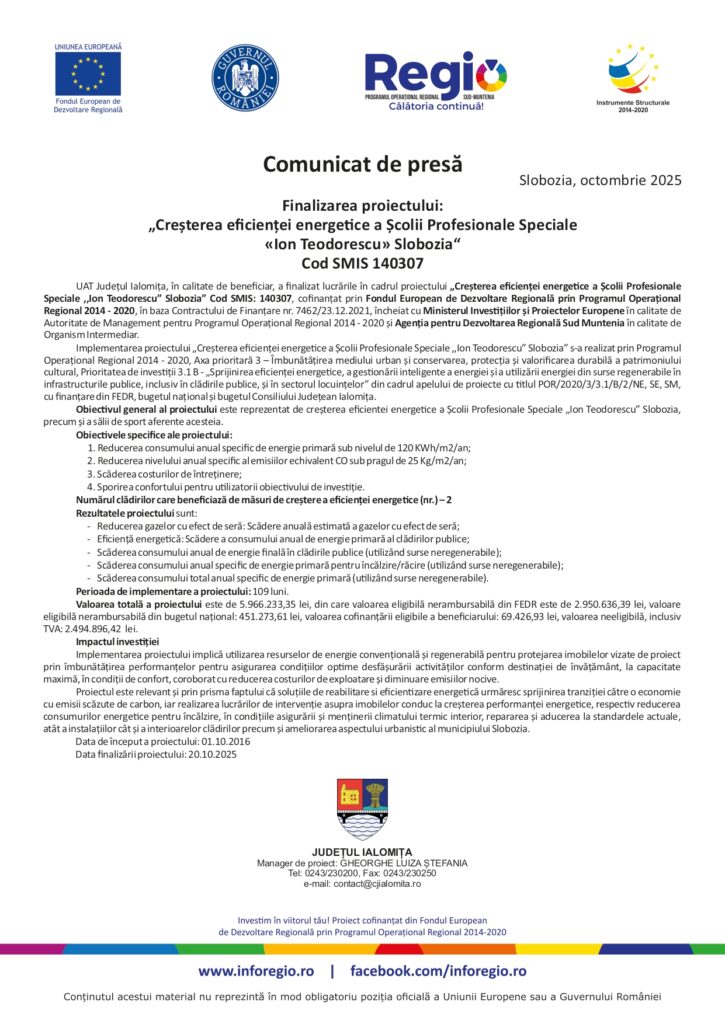 Comunicate de presa, comunicate fonduri europene Finalizarea proiectului: „Creșterea eficienței energetice a Școlii Profesionale Speciale «Ion Teodorescu» Slobozia“ De: ExpressPress Data publicare articol: joi, 16 octombrie 2025, 9:13 ExpressPress Autor Alte știri din Comunicate de presa: JTI anunță planuri pentru o nouă fabrică modernă în România vineri, 28 noiembrie 2025, 15:26 Comunicat de presă „PNRR: Fonduri pentru România modernă și reformată!“ Privind lansarea proiectului „Digitalizarea activității Spitalului Județean de Urgență Piatra Neamț” vineri, 28 noiembrie 2025, 14:55 Eficiență energetică pentru toți: 5 gesturi simple care pot reduce factura cu până la jumătate vineri, 28 noiembrie 2025, 13:31