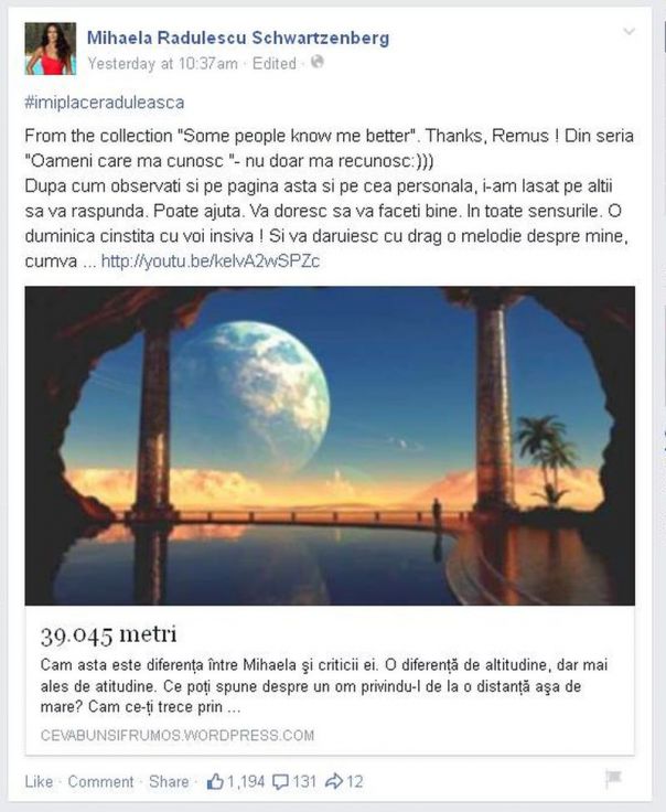 De remarcat hashtagul Mihaelei pe FB, care este: #‎imiplaceraduleasca !. Apoi,  Mihaela Rădulescu comentează, printre altele: „Mircea Badea – mulţam. Esti drept, ai logică şi ai nervi pe proşti şi boală pe ipocriţi, ca şi mine.