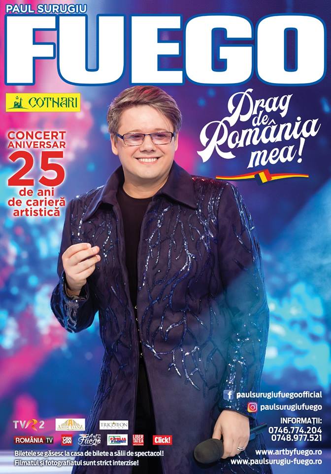 Fuego intâmpină inpreuna cu totii  fani primăvara cum se cuvine și vă arăt de ce mi-s dragi profesia aceasta, muzica, prietenii, țara. Spectacolul poartă un titlu sugestiv – „DRAG DE ROMÂNIA MEA!”, exact ca emisiunea mea săptămânală de pe TVR 2, de duminica, la ora 15.00. Va fi o adevărată feerie și vă garantez clipe de neuitat, cu melodii de suflet și mult romantism, așa cum îmi stă mie bine! Iată mai jos, orașele, datele și locurile în care voi ajunge în luna martie. Bilete găsiți la casele de bilete ale sălilor de spectacol! Informații obțineți la telefonul 0746.774.204! Mai multe detalii pe www.paulsurugiu-fuego.ro și pe www.paulsurugiu-fuego.ro și pe www.artbyfuego.ro! Vă aștept cu drag! #paulsurugiufuego #turneunațional #dragderomâniamea