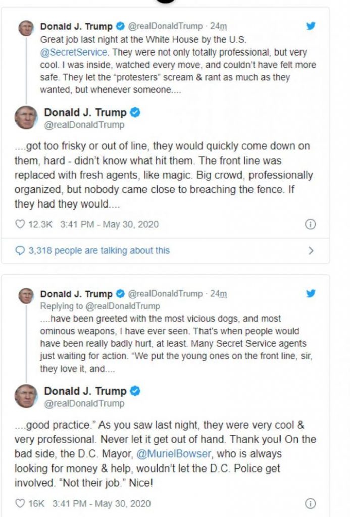 Donald Trump a publicat o nouă serie bizară de postări pe Twitter, după confruntările violente dintre Secret Service și protestatarii din Washington DC. Trump a descris, jubilând, despre felul în care cetățenii americani erau loviți cu gaze lacrimogene și paralizante în timpul protestelor și cum aceștia ar fi fost devorați de „cei mai feroce câini”, dacă ar fi intrat pe domeniul Casei Albe, scrie CNN.