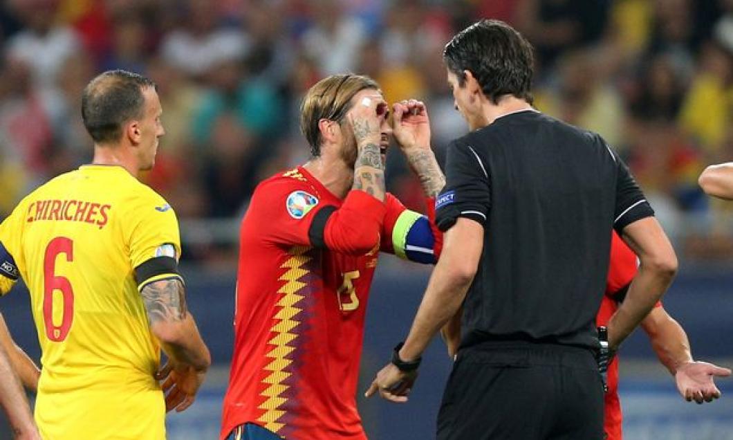 Căpitanul naționalei Spaniei a mers în fața camerei și și-a pus mâinile la ochi. Fanii români au considerat că a fost un gest provocator și l-au huiduit tot restul meciului, la fiecare atingere de balon. Centralul partidei, Deniz Aitekyn, a decis să îi acorde cartonaşul galben lui Ramos, care a încercat degeaba să îi explice şi chiar să îi reproducă arbitrului gestul făcut.