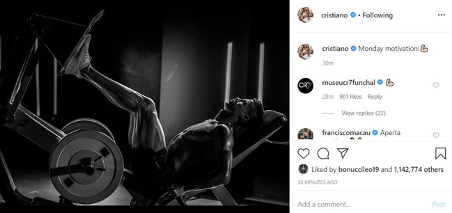 În mai puţin de jumătate de oră, portughezul a adunat peste un milion de like-uri la imaginea pe care a descris-o cu mesajul: „Monday motivation” (n.red. – motivaţia de luni).