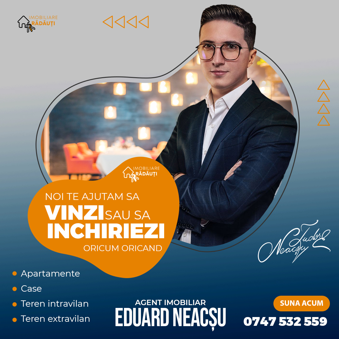 Un agent imobiliar cu experiență va prelua cerințele tale și va face demersurile necesare pentru a te ajuta să-ți găsești proprietățile dorite. Agenția Imobiliare Rădăuți publică și promovează pe platforma online cele mai noi și convenabile anunțuri imobiliare din municipiu.