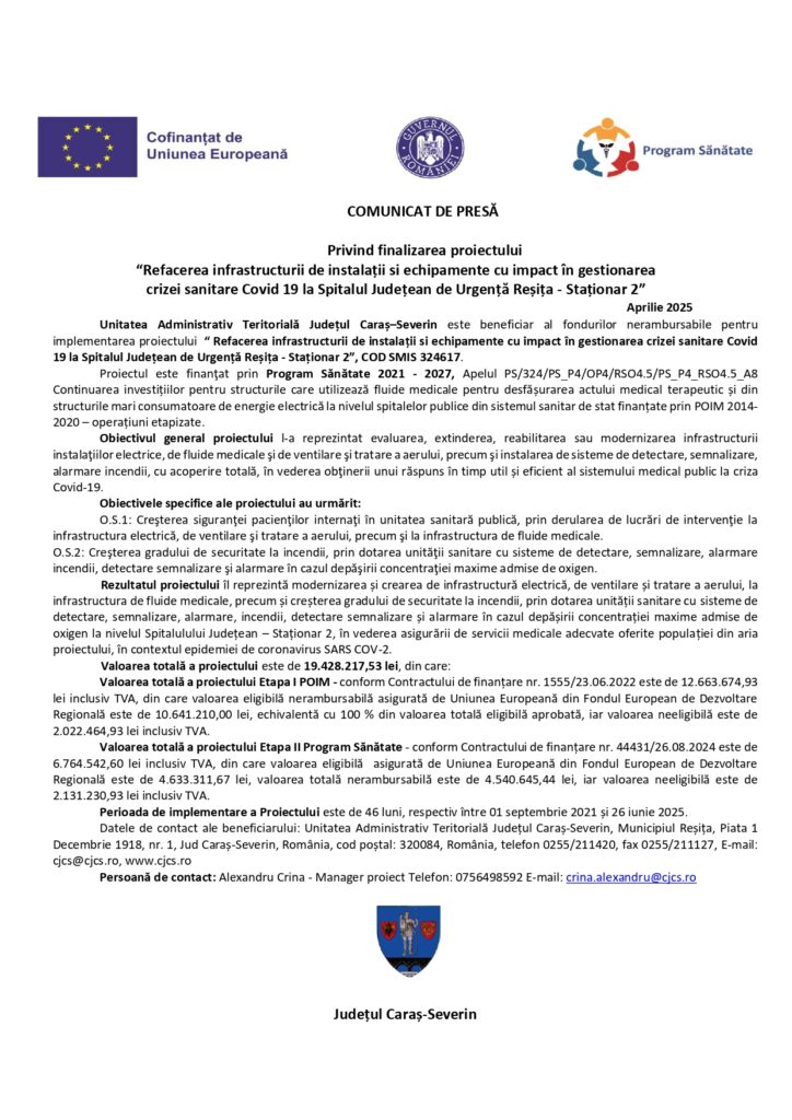 Actualitate, Comunicate de presa, comunicate fonduri europene Implementarea proiectului “ Refacerea infrastructurii de instalații si echipamente cu impact în gestionarea crizei sanitare Covid 19 la Spitalul Județean de Urgență Reșița – Staționar 2” De: ExpressPress Data publicare articol: joi, 10 aprilie 2025, 5:19 ExpressPress Autor Alte știri din Actualitate: Sfârșit de ianuarie cu două anotimpuri. Cum se schimbă vremea în România, în scurt timp duminică, 25 ianuarie 2026, 15:43 De la ger la ploaie. Sfârșit de ianuarie cu temperaturi neașteptate duminică, 25 ianuarie 2026, 7:06 Nicușor Dan, nouă gafă de Ziua Micii Uniri la Focșani sâmbătă, 24 ianuarie 2026, 17:39