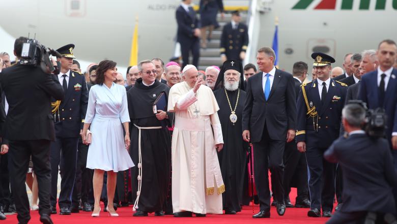 Președintele Klaus Iohannis și soția sa Carmen Iohannis l-au întâmpinat pe aeroport pe Sanctitatea Sa Papa Francisc, transmițându-i Suveranului Pontif că este o plăcere prezența acestuia pe pământ românesc.