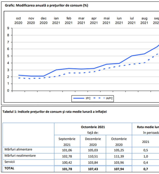 Rata medie a preţurilor de consum în ultimele 12 luni (noiembrie 2020 – octombrie 2021) faţă de precedentele 12 luni (noiembrie 2019 – octombrie 2020) determinată pe baza IAPC este 3,3%.