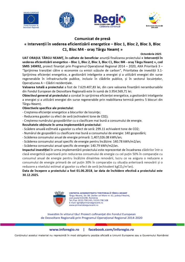Actualitate, Comunicate de presa, comunicate fonduri europene Intervenții în vederea eficientizării energetice – Bloc 1, Bloc 2, Bloc 3, Bloc C1, Bloc M4 – oraș Târgu Neamț De: ExpressPress Data publicare articol: miercuri, 29 octombrie 2025, 6:44 ExpressPress Autor Alte știri din Actualitate: Polonia cumpără sistem de apărare anti-drone contra lui Putin de 3.500.000.000€. Cu ce ripostează România? vineri, 30 ianuarie 2026, 17:56 Două avioane de spionaj americane plecate din Constanța au survolat Marea Neagră. Transmit date la Pentagon vineri, 30 ianuarie 2026, 14:23 Vine o primăvară cum n-a mai fost în România. Vremea la început de martie vineri, 30 ianuarie 2026, 14:09
