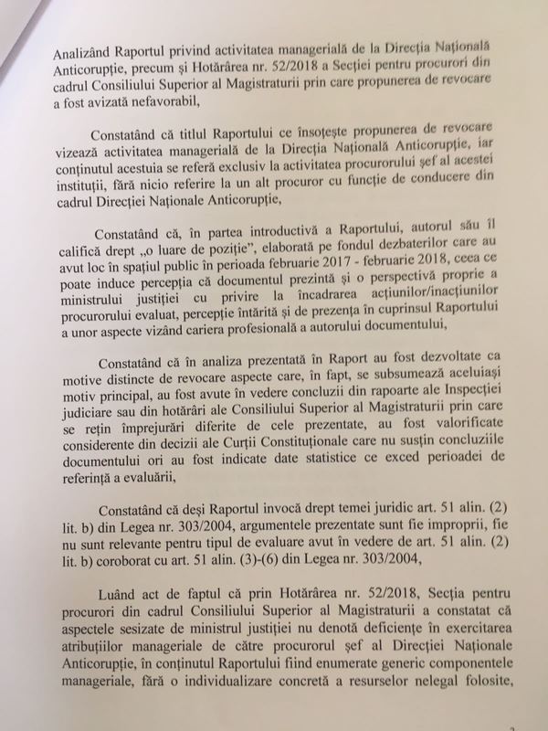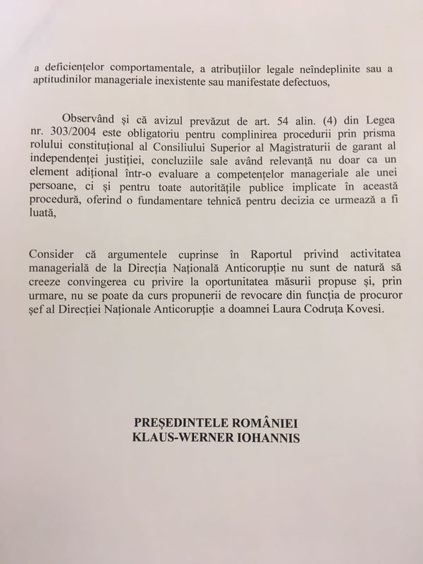 „Analizând motivele pentru care Ministrul Justiţiei solicită revocarea procurorului şef al DNA, am constatat că autorul Raportului, raport care a însoţit propunerea, consideră că acesta este, citez, „o luare de poziţie” faţă de dezbaterile publice din ultimul an, ceea ce, clar, induce percepţia că evaluarea Ministrului Justiţiei poate fi subiectivă. Această percepţie este întărită şi de prezenţa în cuprinsul Raportului a unor aspecte referitoare la cariera profesională a Ministrului Justiţiei. De asemenea, unele dintre motivele care fundamentează propunerea de revocare utilizează date şi informaţii care fie nu sunt pertinente, fie exced perioada anunţată de Ministru ca fiind evaluată. Unele rapoarte ale Inspecţiei Judiciare, hotărâri ale CSM sau decizii ale Curţii Constituţionale au fost interpretate şi valorificate de Ministrul Justiţiei într-un sens cel puţin diferit faţă de conţinutul lor. Drept urmare, motivele de revocare prezentate de Ministrul Justiţiei nu au fost de natură să mă convingă. De altfel, în mare parte, ele nici nu corespund prevederilor legale aplicabile. În concluzie, nu voi da curs propunerii Ministrului Justiţiei de revocare a doamnei Kövesi, procuror şef al DNA”, a spus Iohannis.