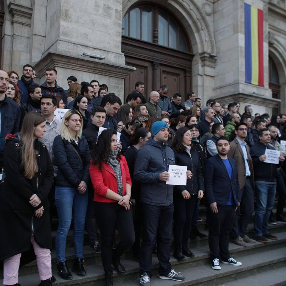 Magistraţii protestează în tăcere pe scările Curţii de Apel Bucureşti, având pancarte pe care scrie „Respectaţi statul de drept”, „We share the same values. RO belongs in EuROpe” („Avem aceleaşi valori. Locul ROmâniei este în EuROpa”), „Independent magistrates – Independent justice” („Magistraţi independenţi – justiţie independentă”), scrie news.ro.