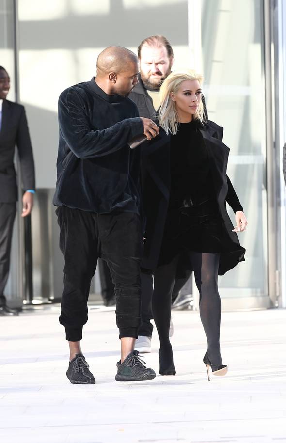 Kim Kardashian a pasit la bratul sotului ei intr-o tinuta „all black” formata dintr-o rochie scurta neagra, un palton negru si, complet neobisnuit pentru stilul ei, un dres negru. Sotul ei, Kanye, a purtat tot o tinuta neagra din ca pana-n picioare. Nimic nou aici, avand in vedere ca pentru aproape fiecare aparitie publica din ultima perioada cei doi au ales tinute „all black”. De data asta, insa, coafura lui Kim aduce putina luminozitatea in look-ul lor, in timp ce machiajul este acelasi smoky eye cu care ne-a obisnuit completat de buze nude.