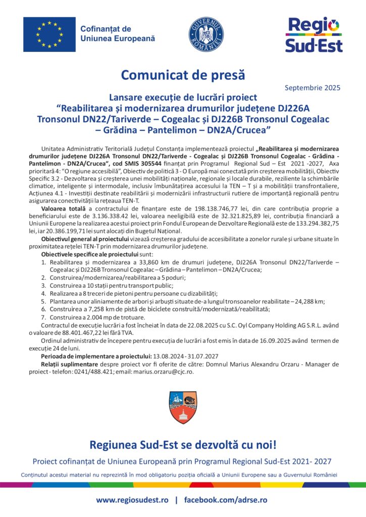 Actualitate, Comunicate de presa, comunicate fonduri europene Lansare execuție de lucrări proiect “Reabilitarea și modernizarea drumurilor județene DJ226A Tronsonul DN22/Tariverde – Cogealac și DJ226B Tronsonul Cogealac – Grădina – Pantelimon – DN2A/Crucea” De: ExpressPress Data publicare articol: duminică, 28 septembrie 2025, 6:38 ExpressPress Autor Alte știri din Actualitate: Dezvoltarea și optimizarea sistemului de transport public la nivelul Municipiului Onești luni, 16 martie 2026, 11:26 Câte rachete balistice poate doborî România și SUA dacă Iran va ataca baza Mihail Kogălniceanu luni, 16 martie 2026, 9:04 Prognoza meteo, 16 martie. Săptămâna începe cu temperaturi ușor mai scăzute față de cele înregistrate în weekend luni, 16 martie 2026, 7:48