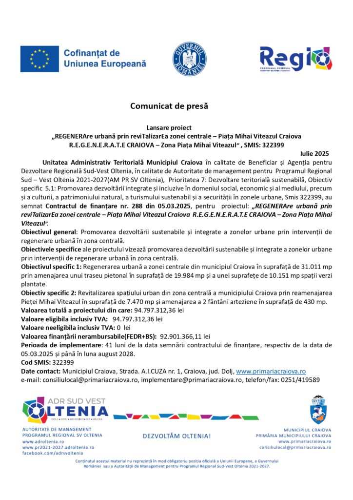 Actualitate, Comunicate de presa, comunicate fonduri europene Lansare proiect „REGENERAre urbană prin reviTalizarEa zonei centrale – Piața Mihai Viteazul Craiova R.E.G.E.N.E.R.A.T.E CRAIOVA – Zona Piața Mihai Viteazul” De: ExpressPress Data publicare articol: joi, 17 iulie 2025, 7:48 ExpressPress Autor Alte știri din Actualitate: Când s-a invocat Articolul 5 al NATO. După 11 septembrie, Alianța a plecat la luptă. România, între combatanți marți, 20 ianuarie 2026, 19:38 Top 5 mărci și modele de foarfeci de tuns pentru frizerii experimentați marți, 20 ianuarie 2026, 19:14 Artroza umărului: de ce apare și cum poate fi tratată? marți, 20 ianuarie 2026, 19:11