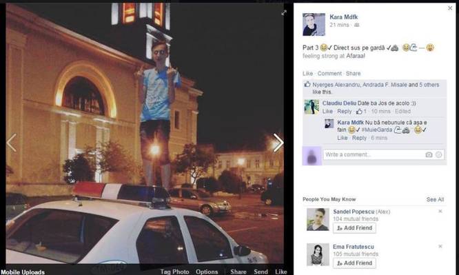 Tupeu maxim! Un tânăr din Lugoj, în vârstă de numai 16 ani s-a pozat în timp ce era căţărat pe una dintre maşinile poliţiei oraşului, parcată la câteva zeci de metri de sediul subunităţii din Lugoj.