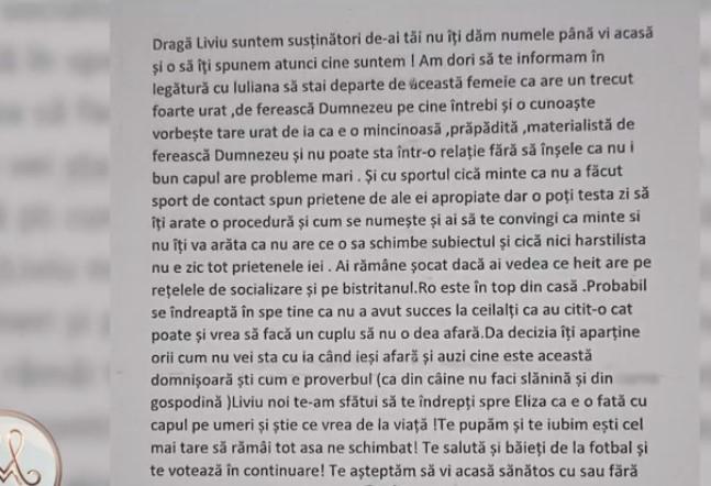 Liviu a primit o scrisoare cu presupuse informații despre Iuliana