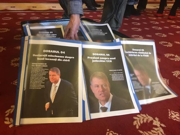 Ia uite, dosarul 01 achiziţia dosarului Raiffeisen. 02 Retrocedări către forumul german al grupului etnic german. 03 promovarea procurorilor care i-au închis dosarelor. 04 declaraţii despre banii încasaţi din chirii. 05 închirierea căminului de bătrâni de la Forumul German. 06 presiuni asupra unui judecator de la Curtea. Şi mai avem nişte stickuri,” a explicat Liviu Dragnea, la intrare.