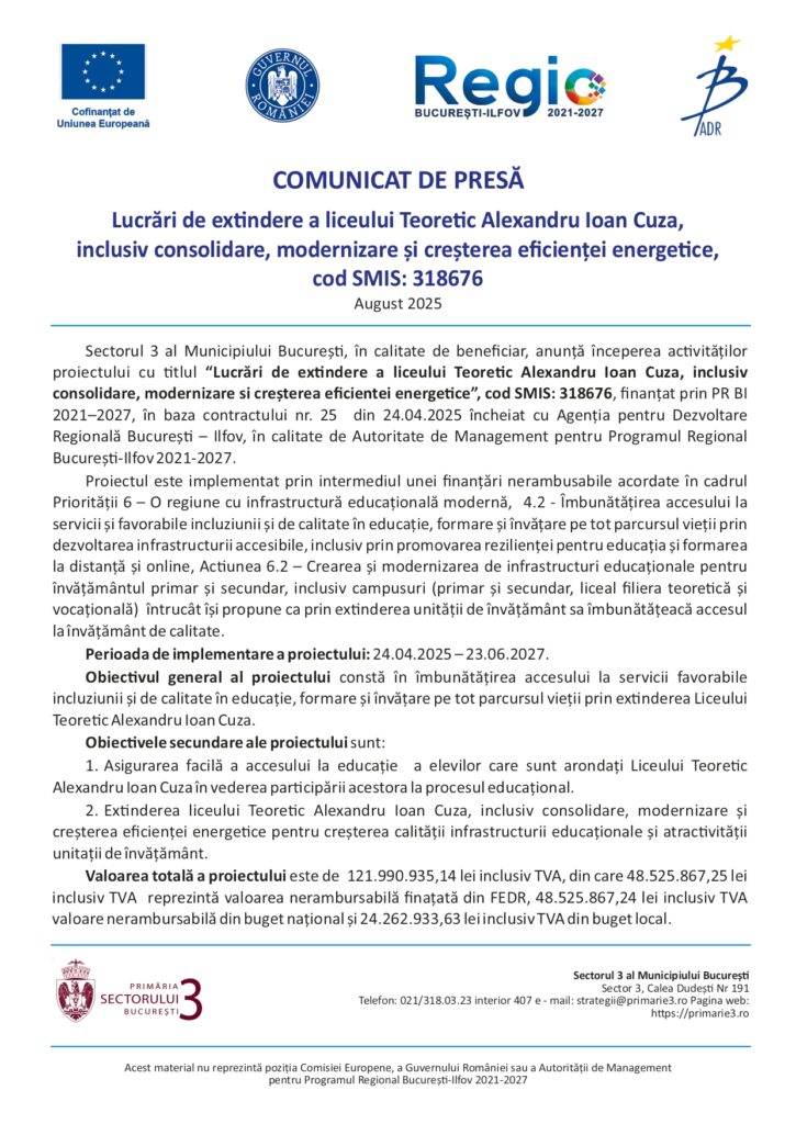 Comunicate de presa Lucrări de extindere a liceului Teoretic Alexandru Ioan Cuza, inclusiv consolidare, modernizare și creșterea eficienței energetice, cod SMIS: 318676 De: ExpressPress Data publicare articol: joi, 21 august 2025, 14:39 ExpressPress Autor Alte știri din Comunicate de presa: „Dotarea cu echipamente specifice în vederea digitalizării Spitalului Clinic Judeţean Sfȃntul Apostol Andrei Constanţa” miercuri, 3 decembrie 2025, 11:43 JTI anunță planuri pentru o nouă fabrică modernă în România vineri, 28 noiembrie 2025, 15:26 Comunicat de presă „PNRR: Fonduri pentru România modernă și reformată!“ Privind lansarea proiectului „Digitalizarea activității Spitalului Județean de Urgență Piatra Neamț” vineri, 28 noiembrie 2025, 14:55
