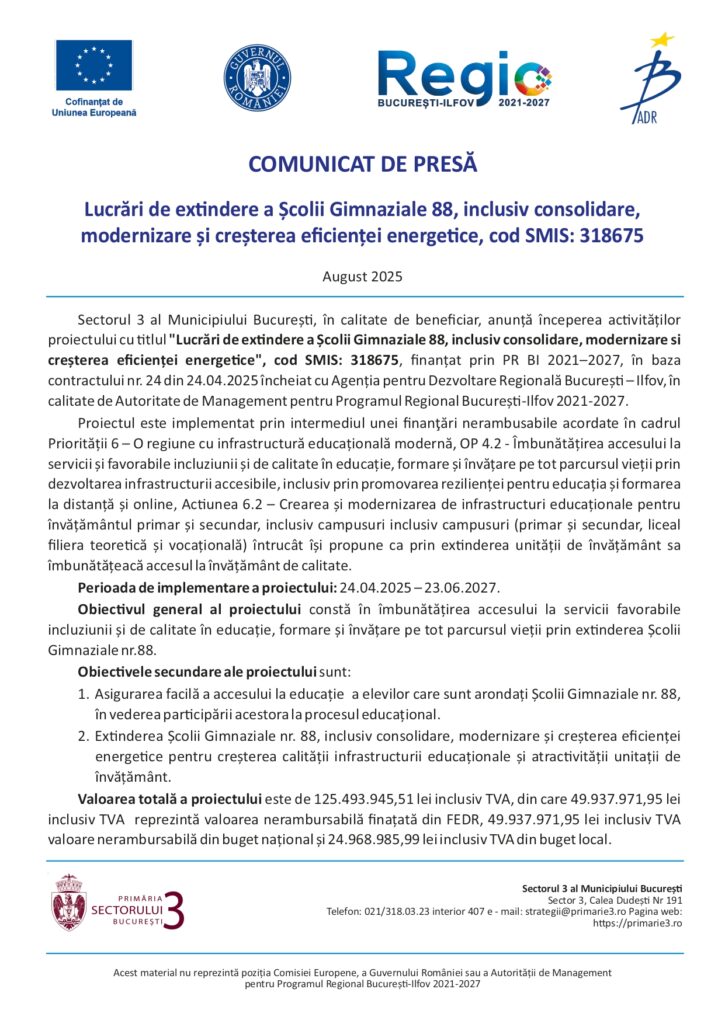 Comunicate de presa Lucrări de extindere a Școlii Gimnaziale 88, inclusiv consolidare, modernizare și creșterea eficienței energetice, cod SMIS: 318675 De: ExpressPress Data publicare articol: joi, 21 august 2025, 13:37 ExpressPress Autor Alte știri din Comunicate de presa: „Dotarea cu echipamente specifice în vederea digitalizării Spitalului Clinic Judeţean Sfȃntul Apostol Andrei Constanţa” miercuri, 3 decembrie 2025, 11:43 JTI anunță planuri pentru o nouă fabrică modernă în România vineri, 28 noiembrie 2025, 15:26 Comunicat de presă „PNRR: Fonduri pentru România modernă și reformată!“ Privind lansarea proiectului „Digitalizarea activității Spitalului Județean de Urgență Piatra Neamț” vineri, 28 noiembrie 2025, 14:55