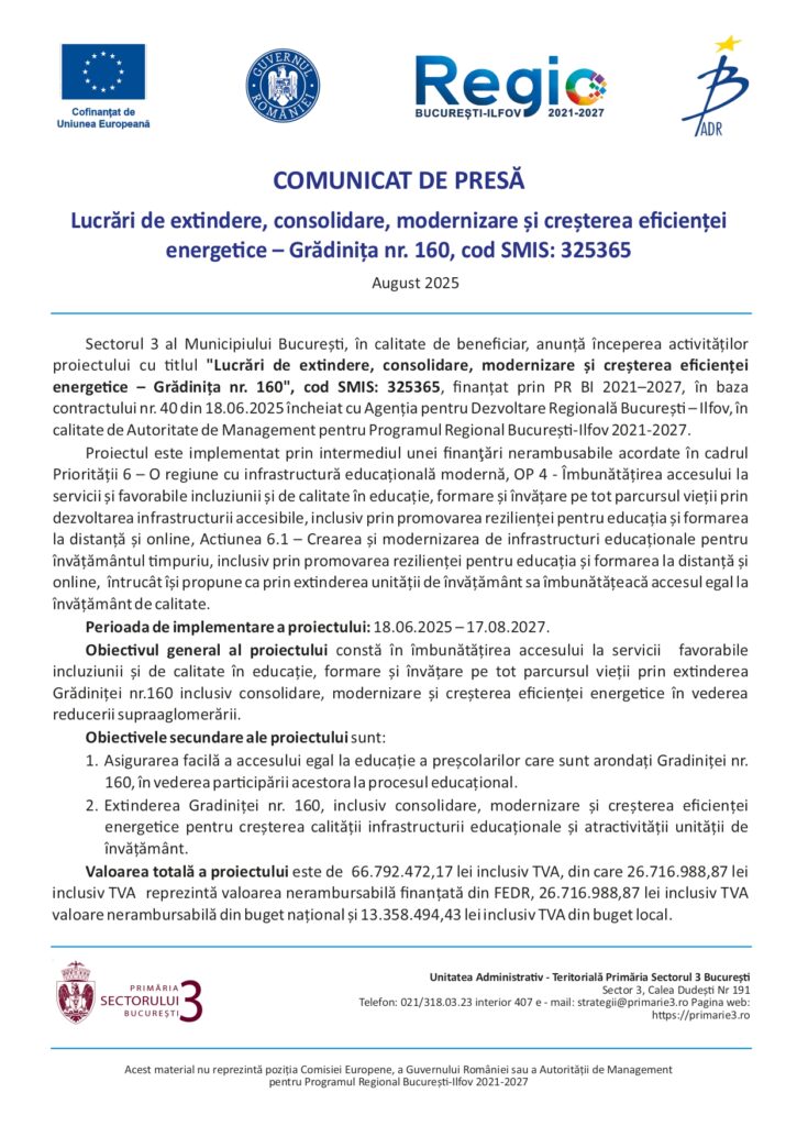Comunicate de presa Lucrări de extindere, consolidare, modernizare și creșterea eficienței energetice – Grădinița nr. 160, cod SMIS: 325365 De: ExpressPress Data publicare articol: joi, 21 august 2025, 14:42 ExpressPress Autor Alte știri din Comunicate de presa: „Dotarea cu echipamente specifice în vederea digitalizării Spitalului Clinic Judeţean Sfȃntul Apostol Andrei Constanţa” miercuri, 3 decembrie 2025, 11:43 JTI anunță planuri pentru o nouă fabrică modernă în România vineri, 28 noiembrie 2025, 15:26 Comunicat de presă „PNRR: Fonduri pentru România modernă și reformată!“ Privind lansarea proiectului „Digitalizarea activității Spitalului Județean de Urgență Piatra Neamț” vineri, 28 noiembrie 2025, 14:55