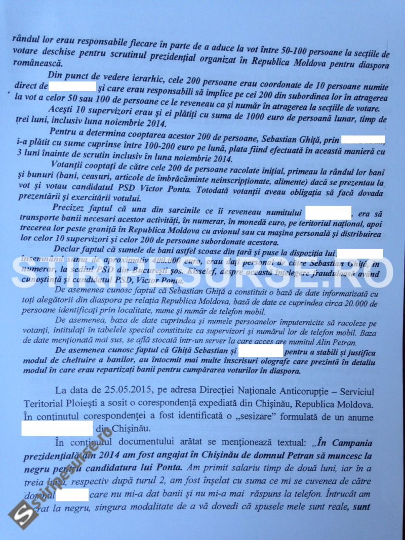 Acesta spune că Sebastian Ghiță își crease un sistem piramidal în Republica Moldova pentru a convinge persoane să voteze cu Victor Ponta. Oamenii primeau bani sau diverse obiecte. În plus, el susține că Victor Ponta știa de tot de făcea Sebastian Ghiță. Denunțătorul vorbește și despre o sumă impresionantă de bani care s-ar fi dat în sediul central al PSD.