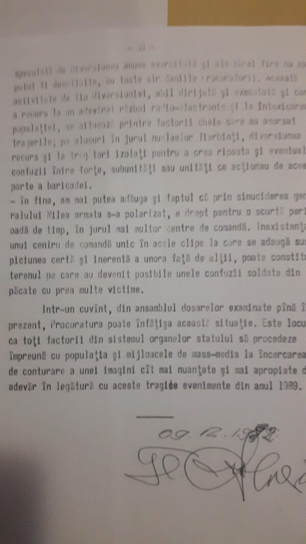 Concluziile procurorilor militari de astazi sunt extrem de asemanatoare cu cele din documentul din 1992, semnat de generalul procuror Mugurel Florescu. Le reproduc, pentru o minima comparaţie, dar mai ales pentru a curma recentele zvonuri care inflamează populația prin susținera că procurorii vor să manipuleze când spun că în decembrie ’89 a fost o Lovitură de Stat și nu o Revoluție. Procurorii nu au susținut niciodată așa ceva, facând de la bun început distincţia între zilele în care revolta populara a facut sa „explodeze mamaliga” la Timişoara şi în Bucureşti şi zilele în care artizanii loviturii de stat şi-au pus planul în aplicare pentru preluarea puterii.