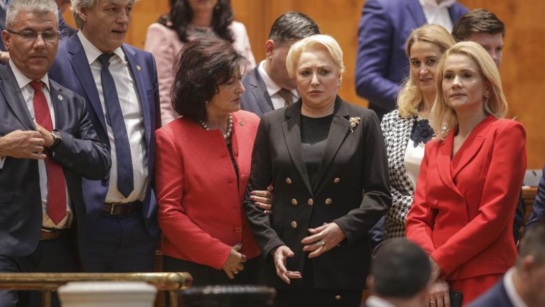 La vot asistă și premierul Viorica Dăncilă, care este înconjurată de parlamentari PSD și membri ai Executivului.