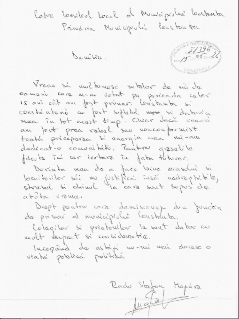 Dupa 15 ani de „domnie” la Primaria Constantei, Radu Mazăre a decis vineri, 22 mai, să-şi dea demisia din funcţia de primar al municipiului. Demisia a fost depusă la secretariatul primăriei, anunţă televiziunea locală Neptun TV, iar ea a venit exact in ziua in care edilul a obtinut eliberarea din arestul preventiv si plasarea sa in arest la domiciliu. Decizia lui Mazare a starnit reactii dintre cele mai diferite printre constanteni, cei mai multi dintre cei intervievati de jurnalisti aratand ca il regreta pe cel care a avut atatea mandate la Primarie, pentru ca, au argumentat oamenii, „a facut multe lucruri bune, ce daca se mai distra si el?”. Fireste ca nu pentru ca se mai distra si el a ajuns Radu Mazare dupa gratii, insa, dincolo de partea comica a argumentatiilor, reactiile oamenilor arata ca edilul a fost apreciat de locuitorii orasului de la malul marii.