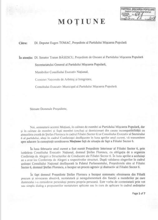 „Prin încălcarea constantă şi vădită, prin nerespectarea statutului de către preşedintele Ştefan Florescu, precum şi prin caracterul nestatutar al Consiliului Executiv al Sectorului 6, se constată ilegalitatea şi funcţionarea nestatutară a Filialei Sector 6. Solicităm, pe această cale, Consiliului Executiv Naţional dizolvarea Filialei Sector 6 şi numirea unui nou preşedinte interimar, cu obligaţia de a organiza o nouă conferinţă de alegeri a structurilor de conducere ale Filialei Sector 6, conform prevederilor Statului şi Regulamentului de Organizare şi Funcţionare ale Partidului Mişcarea Populară”, transmit semnatarii documentului.