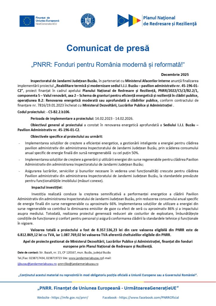 Actualitate, Comunicate de presa ,,Reabilitare termică și modernizare sediul I.J.J. Buzău – pavilion administrativ nr. 45-196-01-C2” De: ExpressPress Data publicare articol: luni, 29 decembrie 2025, 8:08 ExpressPress Autor Alte știri din Actualitate: Ministerul Apărării a pregătit forțe de reacție imediată. Deveselu, protecție contra rachetelor Iranului luni, 2 martie 2026, 6:32 Lucruri mai puțin știute despre Mărțișor. Cum influențează norocul și sănătatea duminică, 1 martie 2026, 11:36 Prognoza meteo, 1 martie. Prima zi de primăvară vine cu temperaturi de până la 17 grade. Unde va fi mai frig duminică, 1 martie 2026, 8:07