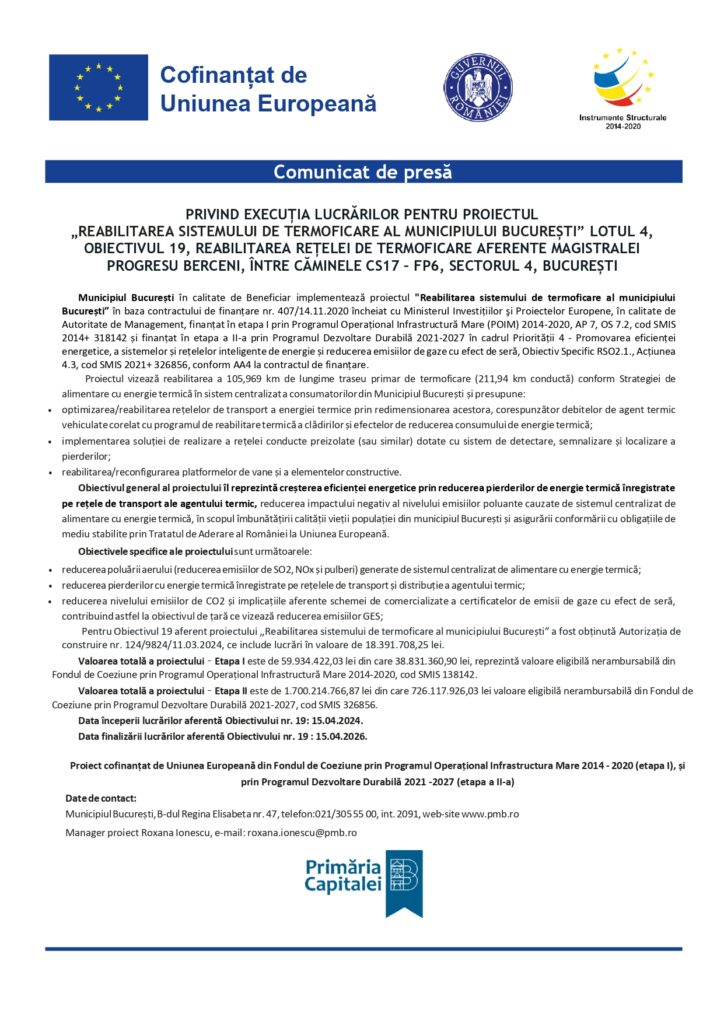 Actualitate, Comunicate de presa, comunicate fonduri europene „REABILITAREA SISTEMULUI DE TERMOFICARE AL MUNICIPIULUI BUCUREȘTI” LOTUL 4, OBIECTIVUL 19, REABILITAREA REȚELEI DE TERMOFICARE AFERENTE MAGISTRALEI PROGRESU BERCENI, ÎNTRE CĂMINELE CS17 – FP6, SECTORUL 4, BUCUREȘTI De: ExpressPress Data publicare articol: marți, 22 iulie 2025, 1:30 ExpressPress Autor Alte știri din Actualitate: Rusia amenință voluntarii români din grupul de luptă „Getica”, aflați pe front în Ucraina: „Vor fi trași la răspundere”/ Getica: „Nu ar trebui să ne fie frică, ci milă de Rusia” sâmbătă, 6 decembrie 2025, 16:41 Ciclonul Byron mătură România. Alerte meteorologice emise de ANM sâmbătă, 6 decembrie 2025, 14:10 Prognoza meteo, 6 decembrie. Început de weekend cu vreme închisă și instabilă. Unde va ploua sâmbătă, 6 decembrie 2025, 8:16