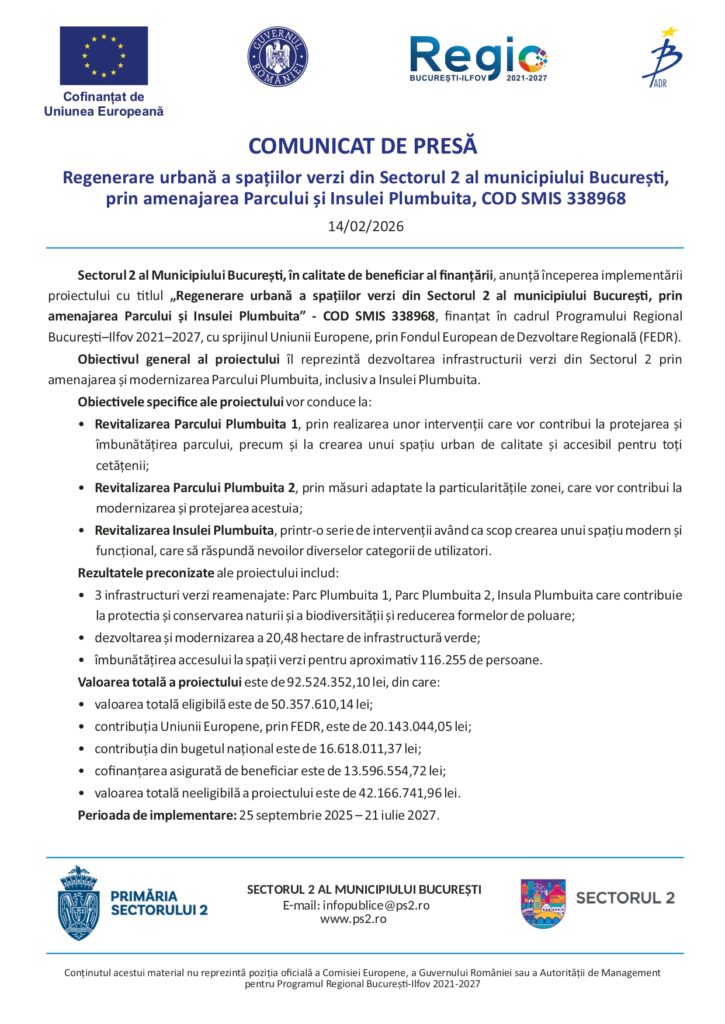 Actualitate, Comunicate de presa, comunicate fonduri europene Regenerare urbană a spațiilor verzi din Sectorul 2 al municipiului București, prin amenajarea Parcului și Insulei Plumbuita De: ExpressPress Data publicare articol: sâmbătă, 14 februarie 2026, 6:09 ExpressPress Autor Alte știri din Actualitate: Controversatul Dosar ICA se rejudecă. Pe ce s-a bazat cererea de revizuirie, admisă de Tribunalul București joi, 5 martie 2026, 9:19 De ce Romania nu e sub „umbrela atomica” a Franței, care va proteja 8 țări? Contraamiral: Se negociază politic miercuri, 4 martie 2026, 8:00 Ministerul Apărării a pregătit forțe de reacție imediată. Deveselu, protecție contra rachetelor Iranului luni, 2 martie 2026, 6:32
