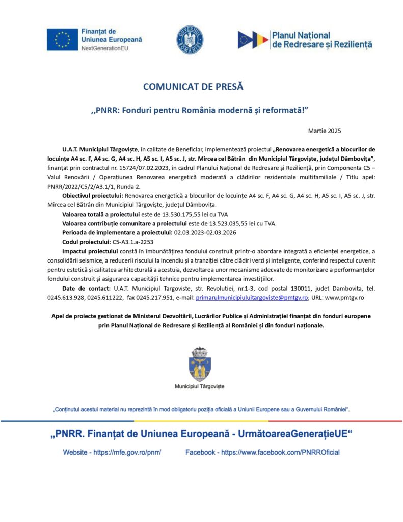 Comunicate de presa, comunicate fonduri europene „Renovarea energetică a blocurilor de locuințe A4 sc. F, A4 sc. G, A4 sc. H, A5 sc. I, A5 sc. J, str. Mircea cel Bătrân din Municipiul Târgoviște, județul Dâmbovița” De: ExpressPress Data publicare articol: luni, 10 martie 2025, 14:00 ExpressPress Autor Alte știri din Comunicate de presa: 5 motive pentru care panourile fotovoltaice premium reduc costurile pe termen lung în sectorul corporate joi, 5 martie 2026, 11:57 Renovare energetică a clădirilor publice – Școala Gimnazială „Sfânta Maria” Botoșani sâmbătă, 28 februarie 2026, 13:05 EFICIENTIZARE ENERGETICĂ CORP CLĂDIRE ATELIER-COLEGIUL TEHNIC CÂMPULUNG vineri, 27 februarie 2026, 18:34