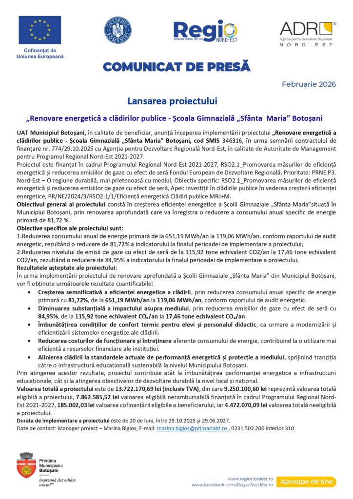 Actualitate, Comunicate de presa, comunicate fonduri europene Renovare energetică a clădirilor publice – Școala Gimnazială „Sfânta Maria” Botoșani De: ExpressPress Data publicare articol: joi, 26 februarie 2026, 15:05 ExpressPress Autor Alte știri din Actualitate: O dronă rusească a intrat în spaţiul aerian al României. Două avioane F-16 au fost ridicate de la Baza Feteşti joi, 26 februarie 2026, 8:24 Prognoza meteo, 26 februarie. Vremea se încălzește ușor în majoritatea regiunilor. Unde vor fi condiții de ceață joi, 26 februarie 2026, 8:08 Polițiștii fac scandal la Guvern, nu acceptă tăieri de salarii și majorarea vârstei de pensionare: „Bolojan este un monstru care vrea doar să pună taxe. Este o ticăloșie ce face!” miercuri, 25 februarie 2026, 8:45