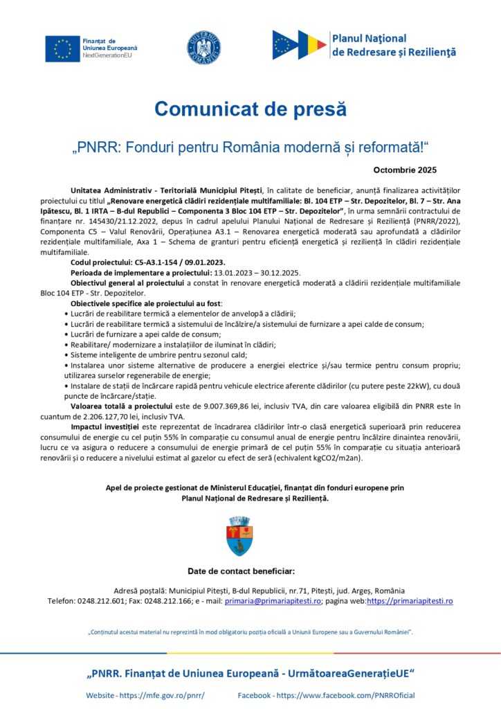 Actualitate, Comunicate de presa, comunicate fonduri europene Renovare energetică clădiri rezidențiale multifamiliale: Bl. 104 ETP – Str. Depozitelor, Bl. 7 – Str. Ana Ipătescu, Bl. 1 IRTA – B-dul Republici – Componenta 1 Bloc 1 ITRA B-dul. Republicii De: ExpressPress Data publicare articol: marți, 7 octombrie 2025, 3:54 ExpressPress Autor Alte știri din Actualitate: Prognoza meteo, 17 ianuarie. Gerul se înăsprește în prima zi de weekend. O singură regiune va fi ocolită de temperaturile scăzute sâmbătă, 17 ianuarie 2026, 7:59 Cât va dura iarna în România. Meteorologii anunță cea mai lungă perioadă de frig din ultimii ani sâmbătă, 17 ianuarie 2026, 6:33 Ambasada Franţei: Prezenţa militară în România nu depinde de negocierile UE-Mercosur. Informaţiile sunt false sâmbătă, 17 ianuarie 2026, 6:19