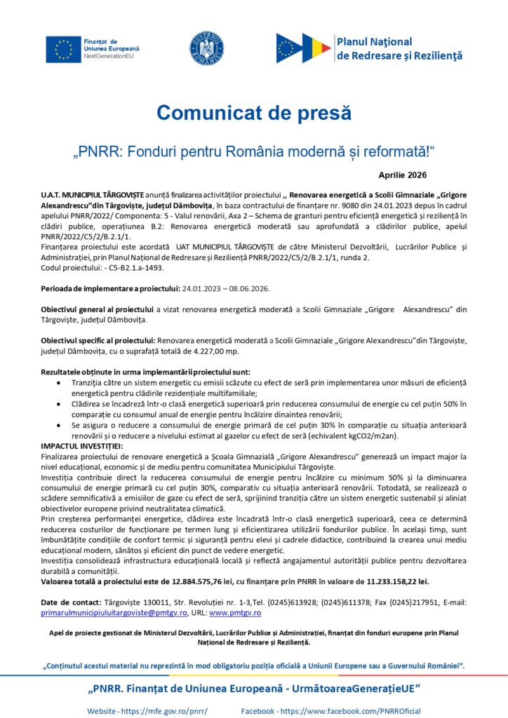 Actualitate, Comunicate de presa, comunicate fonduri europene Renovarea energetică a Scolii Gimnaziale „Grigore Alexandrescu”din Târgoviște, județul Dâmbovița De: ExpressPress Data publicare articol: miercuri, 1 aprilie 2026, 15:23 ExpressPress Autor Alte știri din Actualitate: Prognoza meteo, 7 aprilie. Marțea Mare aduce vreme schimbătoare. Temperaturi în scădere, ploi și ninsori la munte. marți, 7 aprilie 2026, 7:54 Posibile ninsori în zona Capitalei, în următoarele zile. Suspans cu privire la vremea de Paște luni, 6 aprilie 2026, 12:05 Fostul procuror Marian Nazat: „Părăsirea acestui sistem a fost cea mai bună decizie din viața mea” luni, 6 aprilie 2026, 7:17