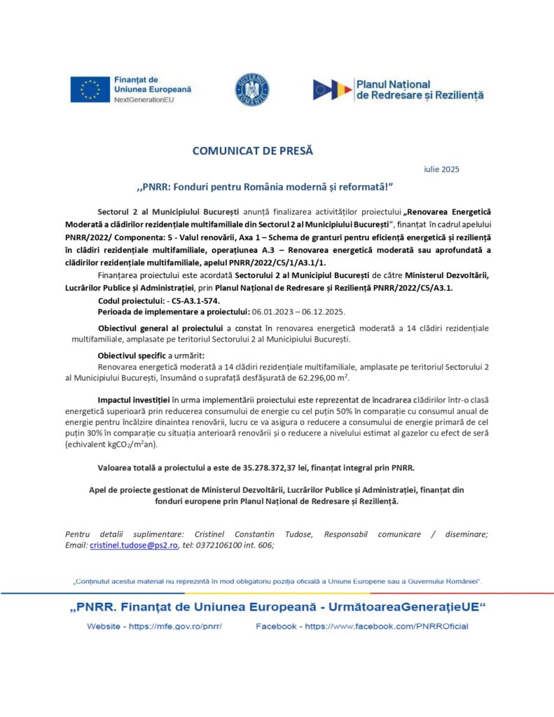 Actualitate, Comunicate de presa, comunicate fonduri europene Renovarea Energetică Moderată a clădirilor rezidențiale multifamiliale din Sectorul 2 al Municipiului București De: ExpressPress Data publicare articol: joi, 31 iulie 2025, 8:14 ExpressPress Autor Alte știri din Actualitate: NATO a aprobat 2.500.000.000€ buget militar. România și țările din Flancul estic, linia întâi contra Rusiei vineri, 19 decembrie 2025, 8:16 Prognoza meteo, 19 decembrie. Final de săptămână cu vreme neobișnuită. Ceața persistentă în unele județe vineri, 19 decembrie 2025, 7:46 A murit profesorul Mircea Coșea, după o grea suferință vineri, 19 decembrie 2025, 7:39