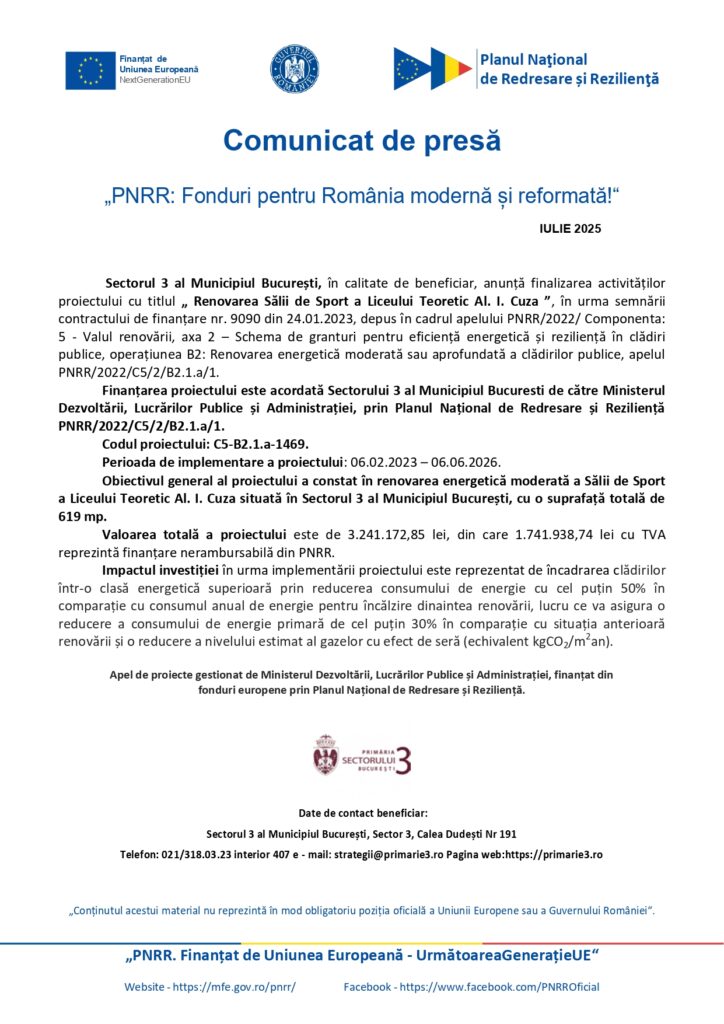 Comunicate de presa, comunicate fonduri europene Renovarea Sălii de Sport a Liceului Teoretic Al. I. Cuza De: ExpressPress Data publicare articol: miercuri, 30 iulie 2025, 18:13 ExpressPress Autor Alte știri din Comunicate de presa: Viitorul diplomației începe la București: Elevii preiau controlul la LTSM MUN 2026 în Senatul României miercuri, 11 februarie 2026, 11:54 „Savox” – Vocea Colegiului Național „Sfântul Sava” din București, aniversează 2 ani de povești care inspiră luni, 2 februarie 2026, 21:53 Consolidare, reabilitare, modernizare și dotare C2 din Academia de Poliție „Alexandru Ioan Cuza joi, 29 ianuarie 2026, 17:13