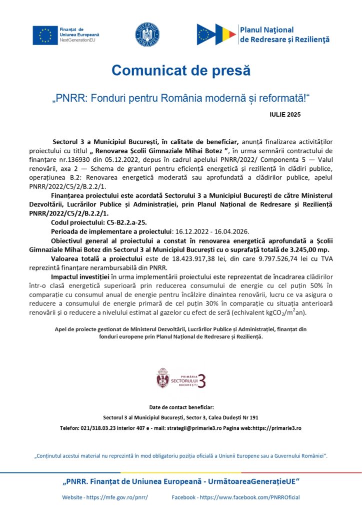 Comunicate de presa „ Renovarea Școlii Gimnaziale Mihai Botez ” De: ExpressPress Data publicare articol: miercuri, 30 iulie 2025, 17:16 ExpressPress Autor Alte știri din Comunicate de presa: Renovarea energetică a Scolii Gimnaziale „Grigore Alexandrescu”din Târgoviște, județul Dâmbovița miercuri, 1 aprilie 2026, 15:23 “Reabilitarea sistemului de termoficare al municipiului București” Cod SMIS 2014+ 138142 vineri, 27 martie 2026, 9:09 „Dotarea laboratoarelor de informatică și a atelierelor de practică a unităților de învățământ profesional și tehnic din Sectorul 2” joi, 26 martie 2026, 9:36